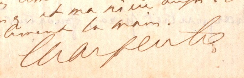Quoi que je pense avoir assez de fonds pour payer toute ma dépense, veuillez m’envoyer dans votre prochaine lettre 200 fr. en deux billets de banque, neufs ou à peu près, car on les refuse ici quand ils sont un peu cornés. Répondez-moi lundi prochain toujours à mon adresse ici, et sauf évènement extraordinaire ne m’écrivez plus. En tout cas après mardi il serait trop tard. Recommandez à la poste votre lettre qui contiendra les 200 fr. & mettez en souscription Mr. Gervais Charpentier éditeur de Paris, car il y a plusieurs personnes de mon nom ici.